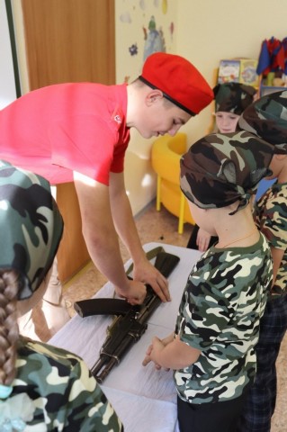 "Юнармейцы 5+" 27 октября в гости к ребятам из подготовительной группы "Золотая рыбка" приходил Юнармейский отряд «Верные сыны Отечества» МАОУ «Уренская СОШ № 1». Они рассказали о движении Юнармия, показали мастер-класс по разборке/сборке автомата и снаряжении магазина на локации «Патриот»,дали урок строевого шага. Так юнармейцы побывали в роли наставников дошколят, которым тоже захотелось составить им достойную смену в будущем. Но, главное, своим примером показали, что значит, быть будущими защитниками Родины, патриотами своей страны. |