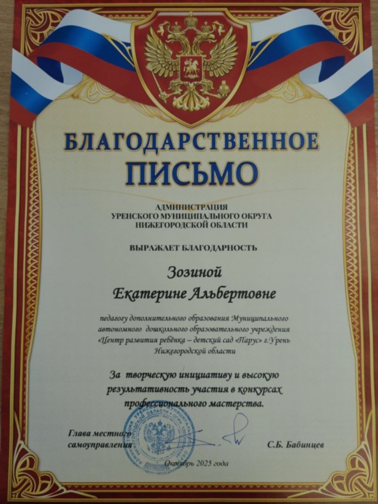| Почетная грамота от управления образования Уренского округа.Абсолютный победитель муниципального этапа Всероссийского конкурса "Воспитатель года- 2025", 2025 год. |